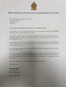 நயினை மணிமேகலை முன்னேற்றக் கழகம் – பிரித்தானியாவினால் £3,750.00 இற்கான காசோலை இலங்கை ரூபாவில் சுமார் 1.5 மில்லியன் நேற்று (18/12) லண்டனிலுள்ள இலங்கை உயர்ஸ்தானிகர் அலுவலகத்தில் வைத்து இலங்கை உயர்ஸ்தானிகரிடம் கையளிக்கப்பட்டது.