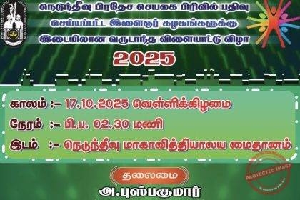நெடுந்தீவு பிரதேச செயலக பிரிவிற்குட்பட்ட பதிவுசெய்யப்பட்ட இளைஞர் கழகங்களுக்கு இடையிலான விளையாட்டு நிகழ்வு இன்று (ஒக்.17)…